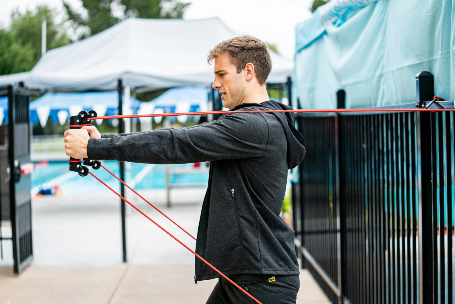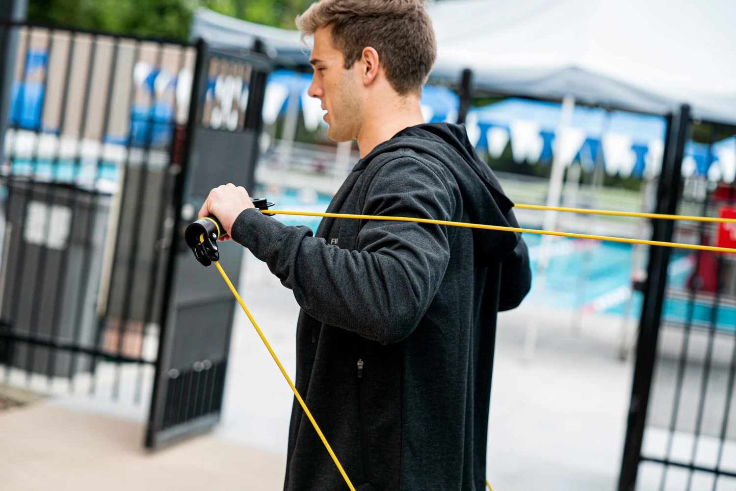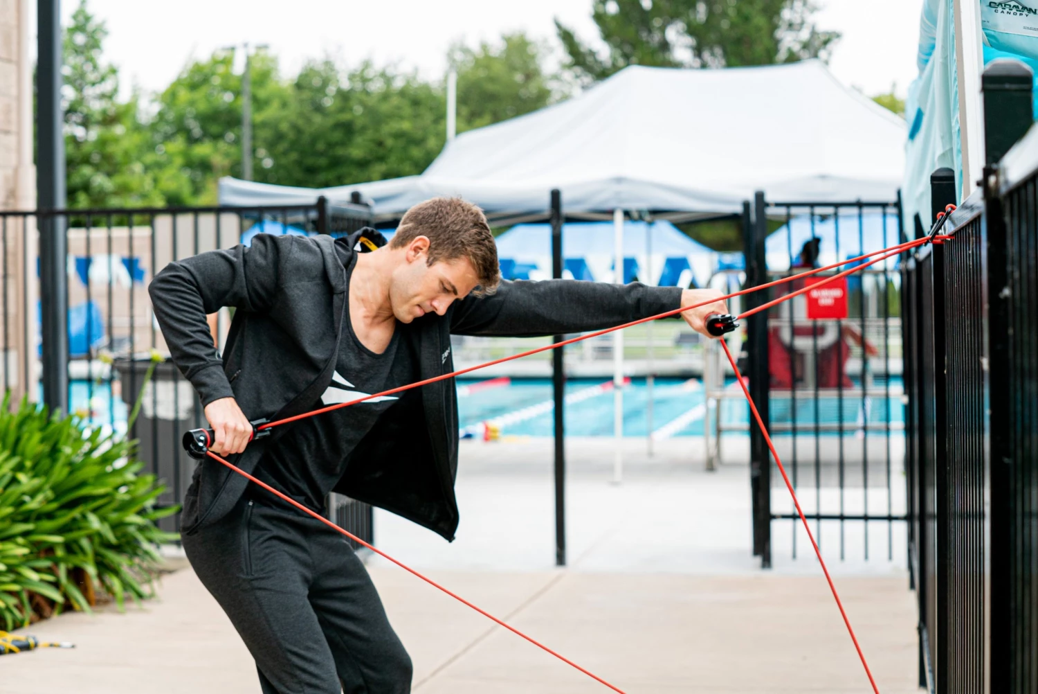 The Slide Dryland Trainer is designed to provide swimmers with exercises that mimic the entire swim stroke cycle with consistent resistance. Attach the cord to two different points on a chain-link fence (or similar) to add variety and different angles to your strength and conditioning training. The two rotating handles allow swimmers to practice hand and forearm positioning without cord interference or overloading.