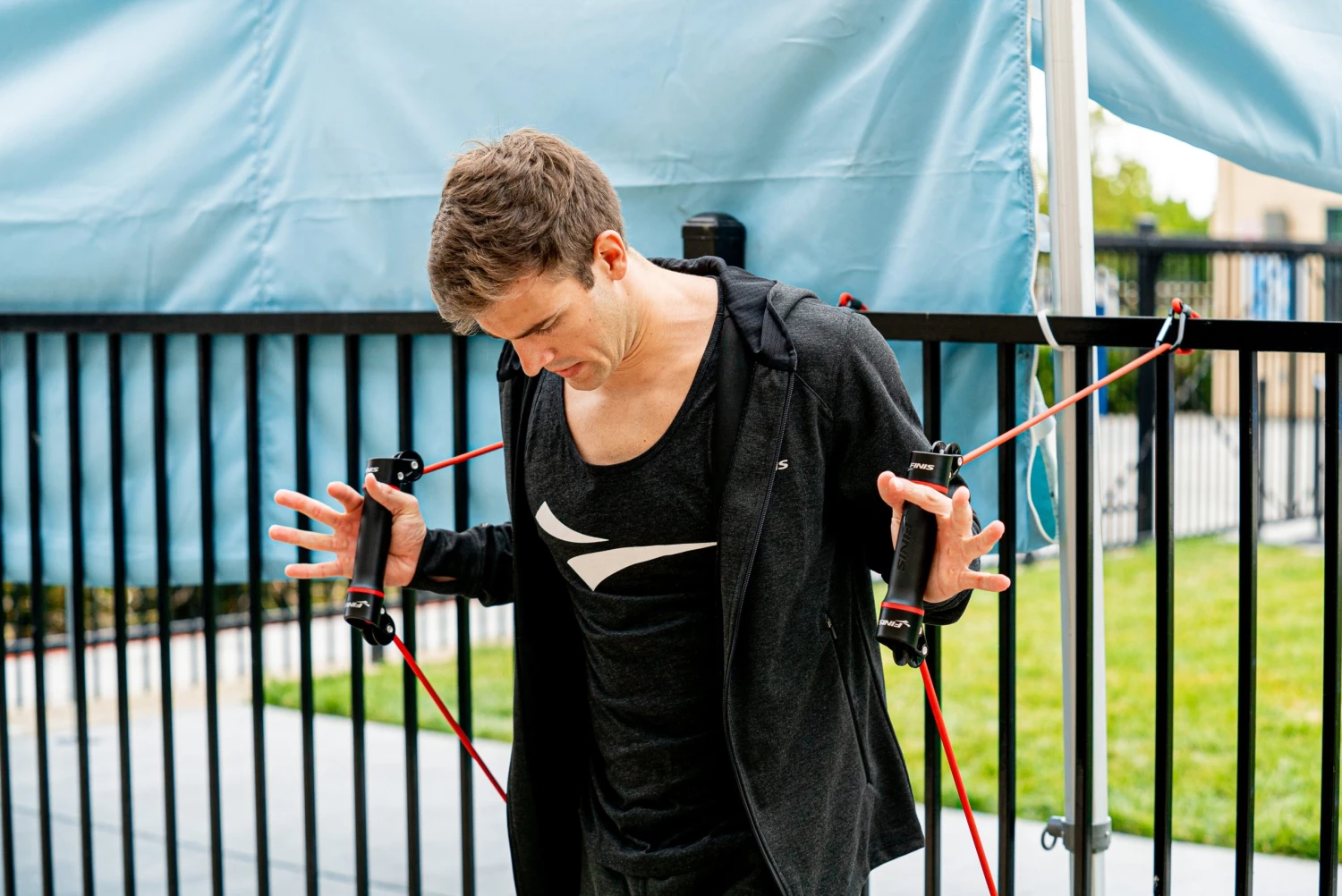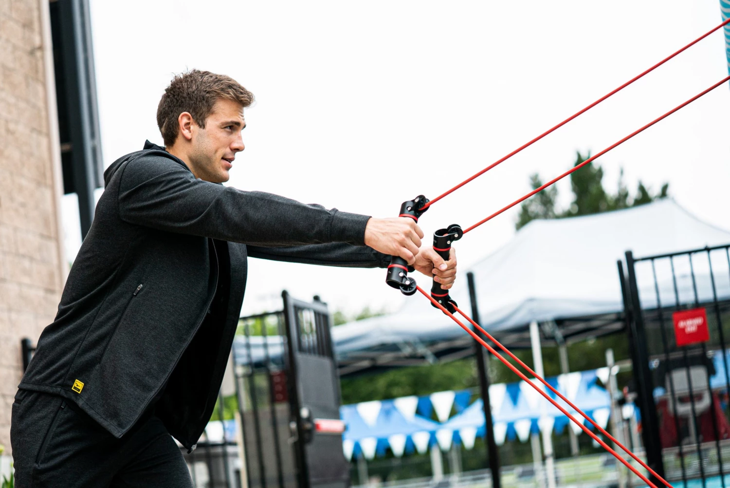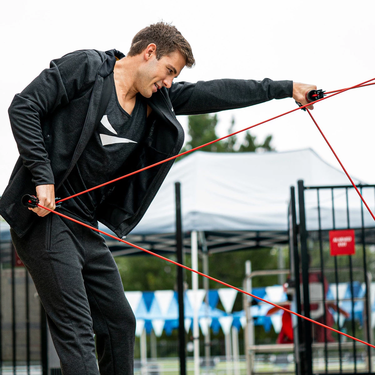 The Slide Dryland Trainer is designed to provide swimmers with exercises that mimic the entire swim stroke cycle with consistent resistance. Attach the cord to two different points on a chain-link fence (or similar) to add variety and different angles to your strength and conditioning training. The two rotating handles allow swimmers to practice hand and forearm positioning without cord interference or overloading.