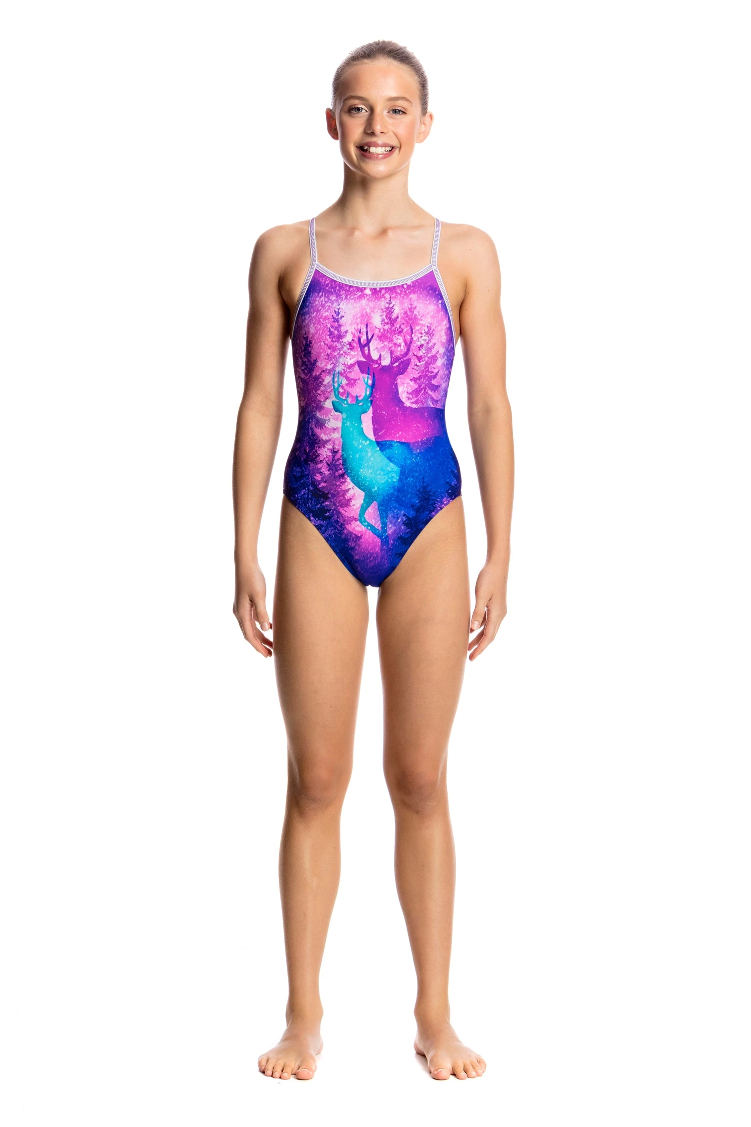 Freedom of movement and a narrower strap finish across the back sets this style apart from the rest. Features a scooped cut-out shape, logo embroidery and lining. Available in girls’ sizes 8 – 14.