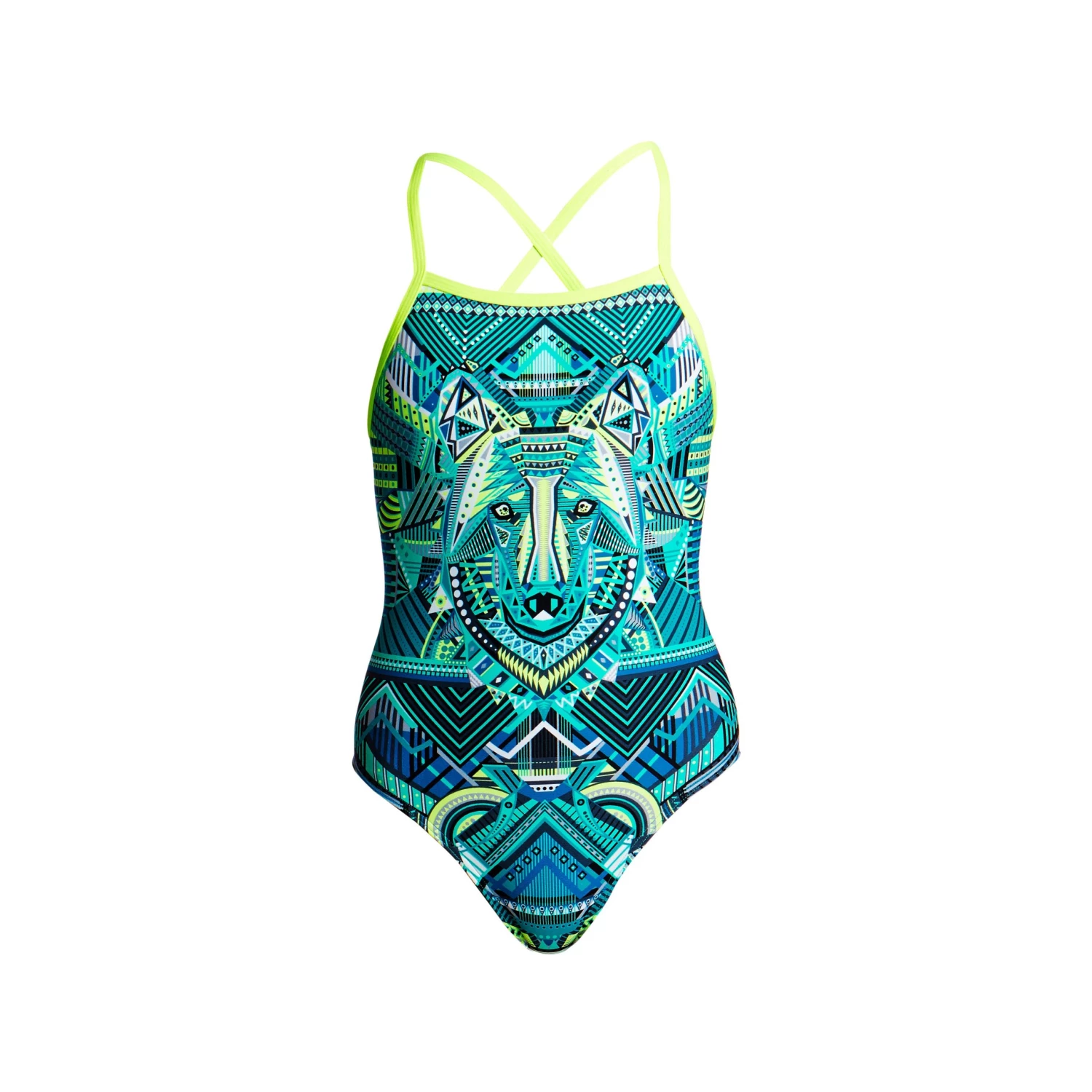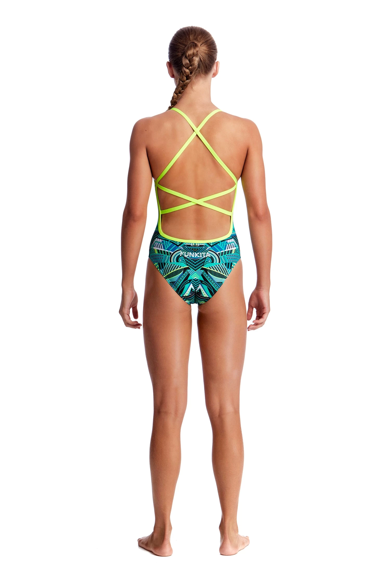 Youāll be sure to get noticed on pool deck in our strappiest one piece yet! Single strap binds that criss cross down your back with a moderately high cut leg.